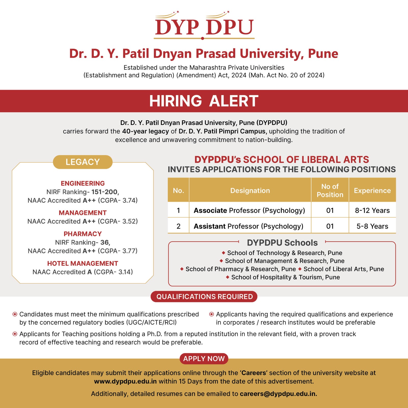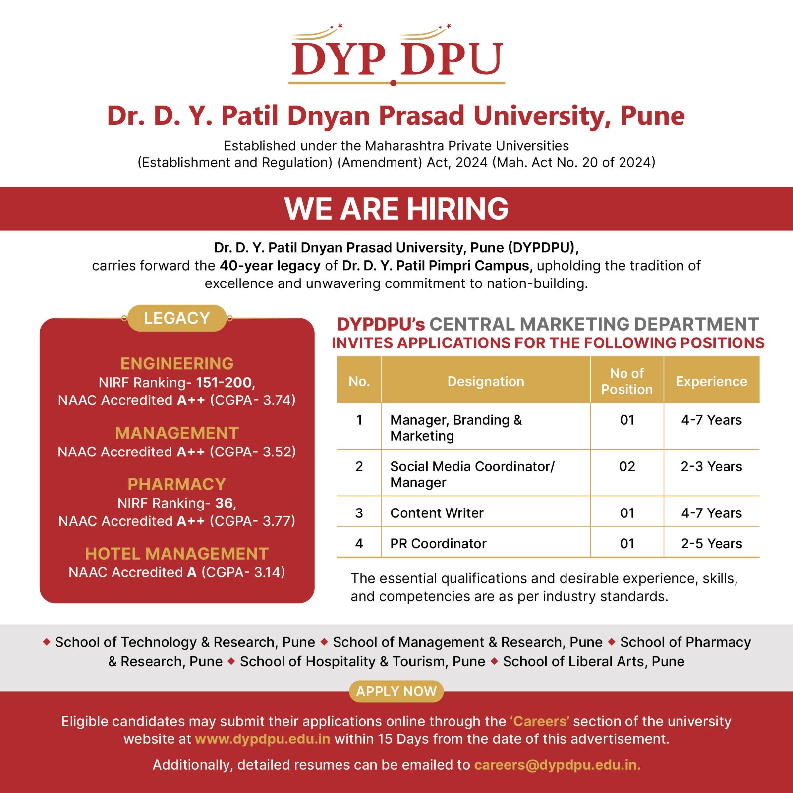 DYPDPU provides excellent opportunity for individuals looking for a rewarding career and expedited advancement. The institute offers exposure to a wide range of local and international resources as part of its global commitment. We distinguish ourselves by integrating state-of-the-art technology and providing individual empowerment coupled with an environment that promotes professional growth. DYPDPU provides a successful trajectory with professional and personal growth for a transformative career path. We look for dynamic and result-oriented individuals for both, academic as well as non-academic roles. Aspirants can sent their CVs to the following e-mail contacts.